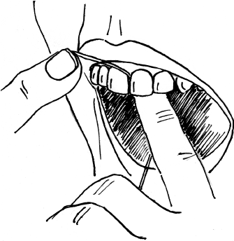 помощью указательных пальцев на нижней челюсти и больших пальцев на верхней